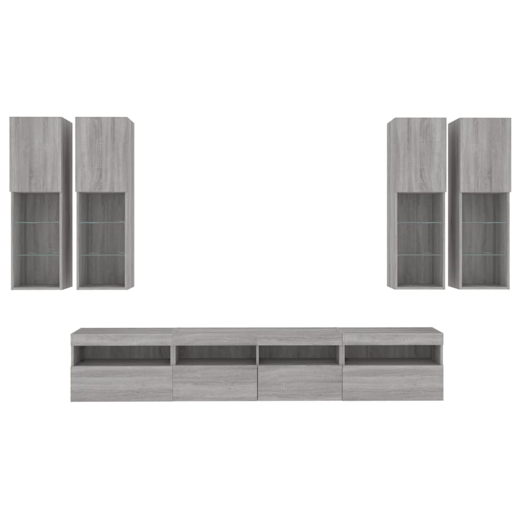 7 pcs conj. móveis de parede p/ TV c/ luzes LED cinzento sonoma