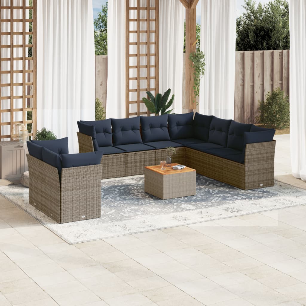 10 pcs conjunto sofás p/ jardim c/ almofadões vime PE cinzento