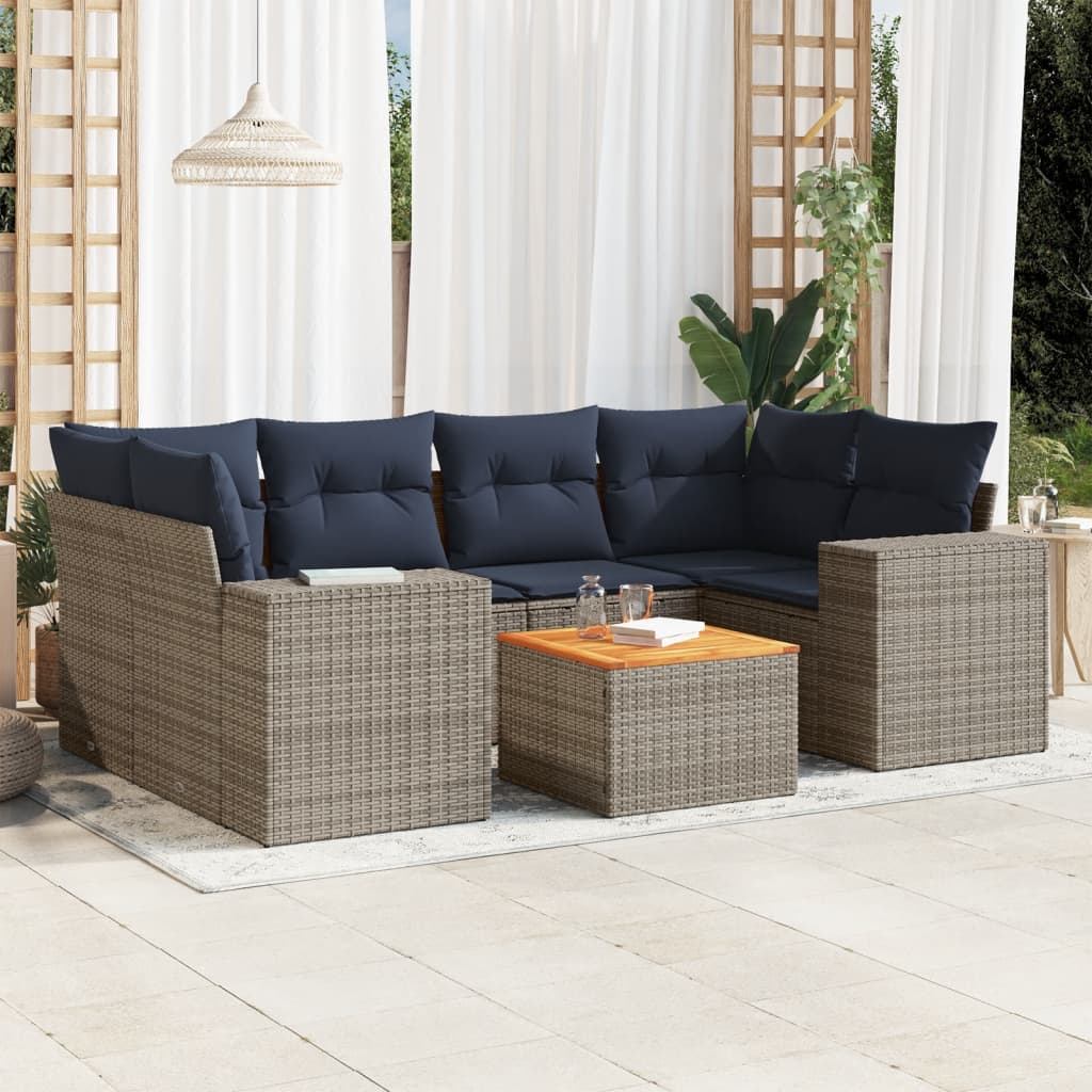 7 pcs conjunto sofás p/ jardim c/ almofadões vime PE cinzento