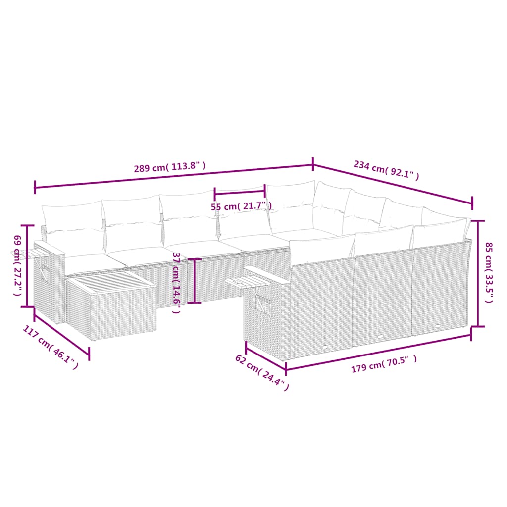11 pcs conjunto sofás de jardim c/ almofadões vime PE cinzento
