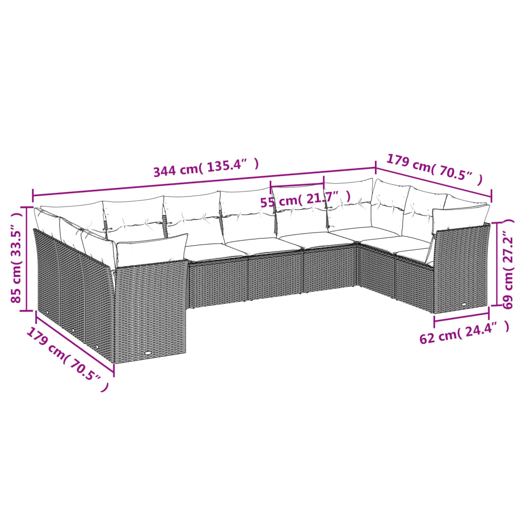 10 pcs conjunto sofás de jardim c/ almofadões vime PE preto