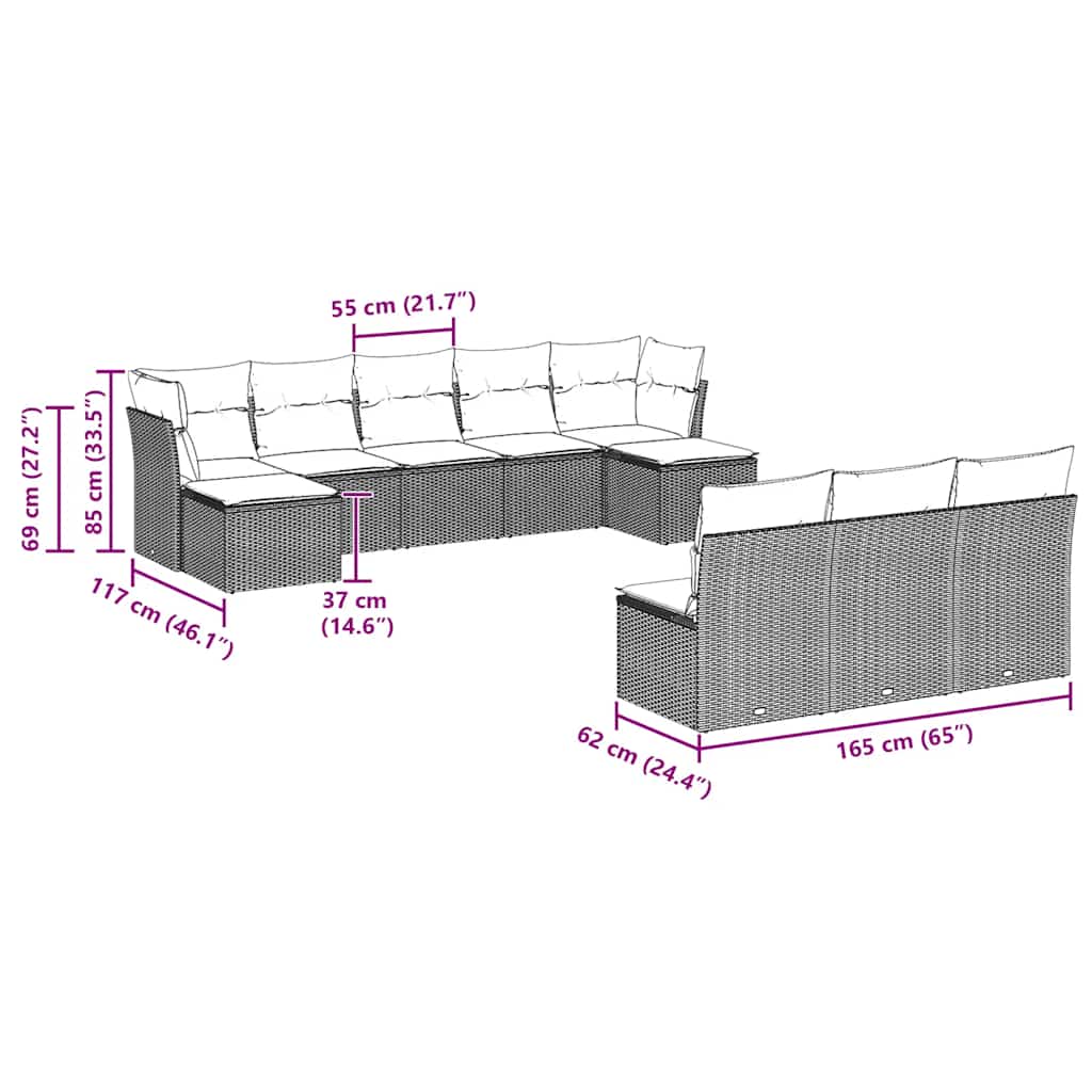 10 pcs conj. sofás jardim com almofadões vime PE cinzento-claro