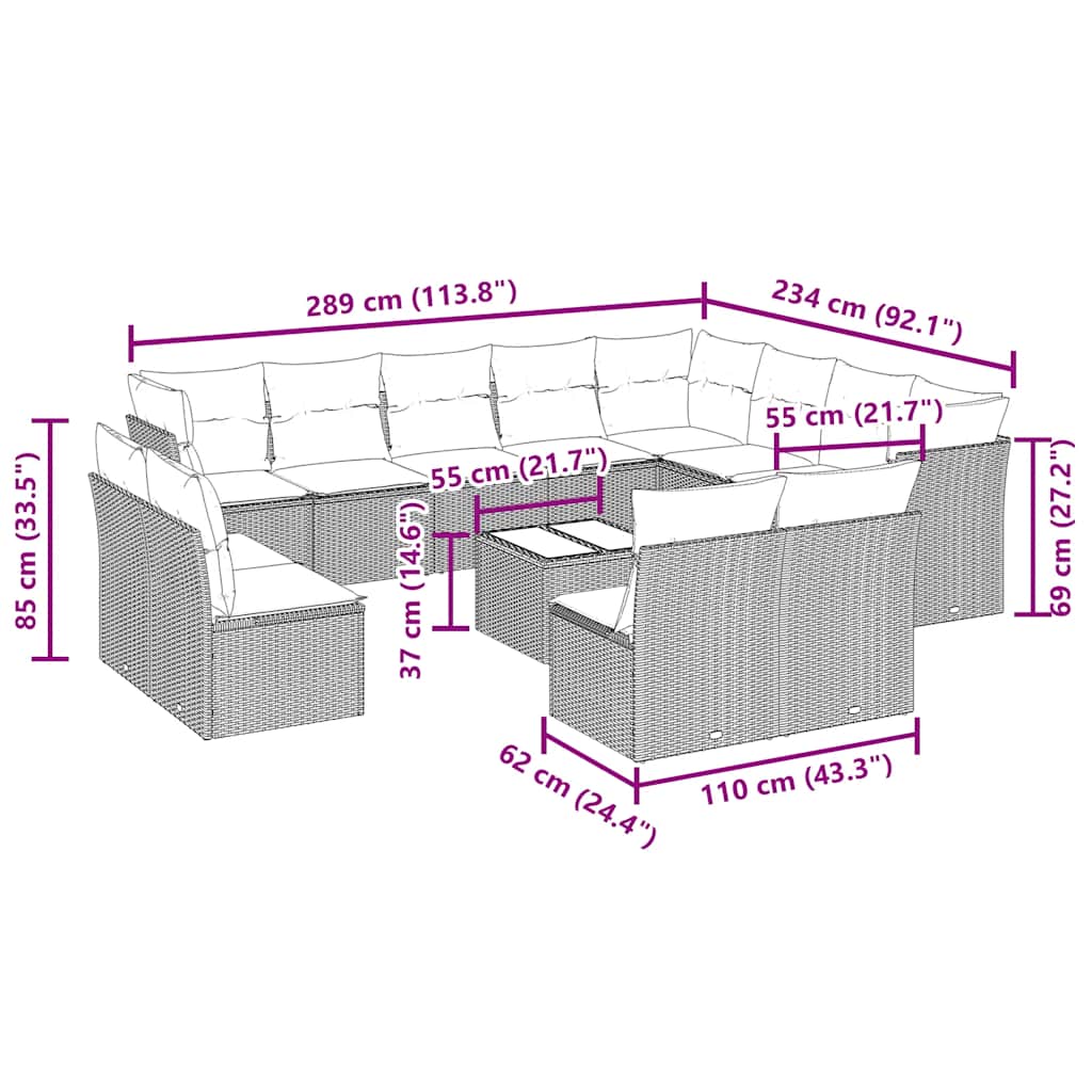 13 pcs conj. sofás jardim c/ almofadões vime PE cinzento-claro