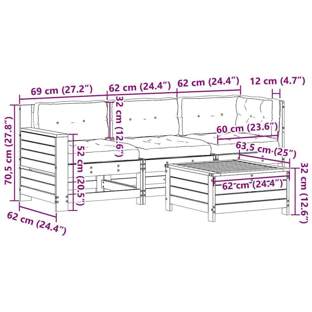 4 pcs conj. lounge de jardim c/ almofadões pinho maciço branco