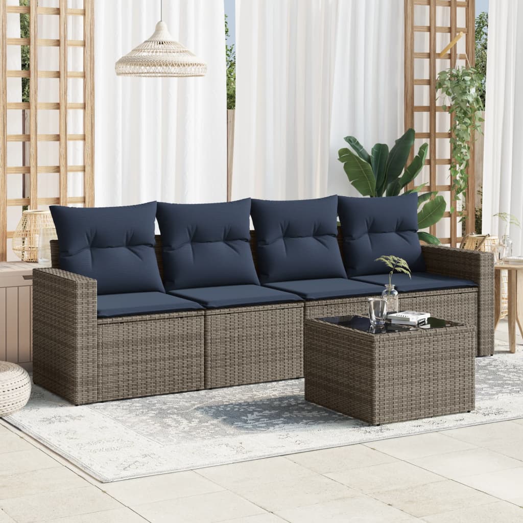 5 pcs conjunto sofás p/ jardim c/ almofadões vime PE cinzento