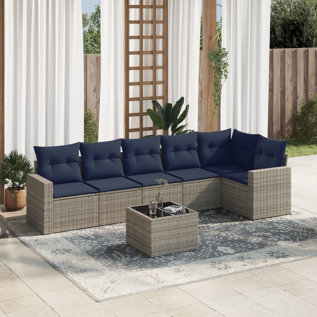 7 pcs conjunto sofás p/ jardim c/ almofadões vime PE cinzento