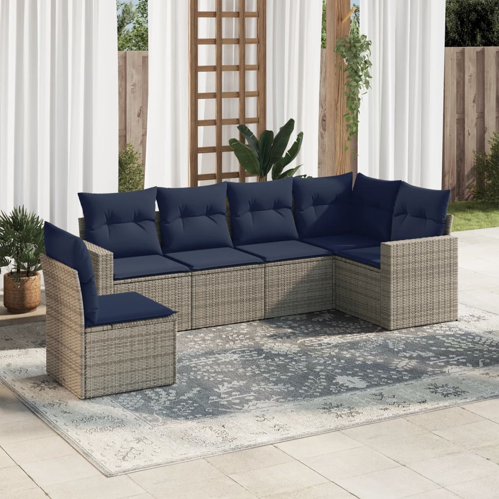 6 pcs conjunto sofás p/ jardim c/ almofadões vime PE cinzento