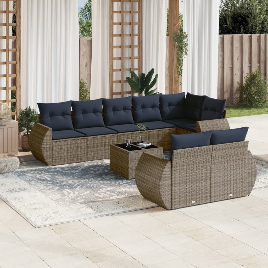 9 pcs conjunto sofás p/ jardim c/ almofadões vime PE cinzento