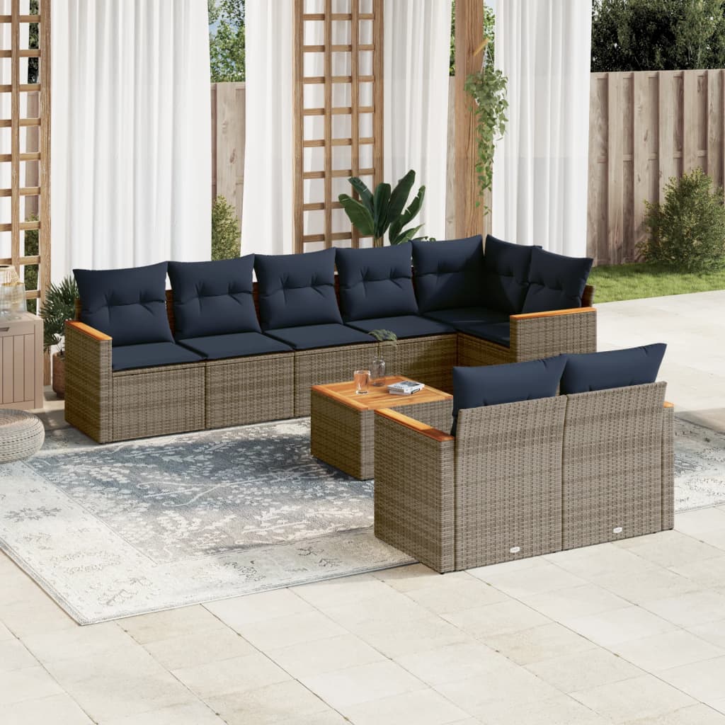 9 pcs conjunto sofás p/ jardim c/ almofadões vime PE cinzento