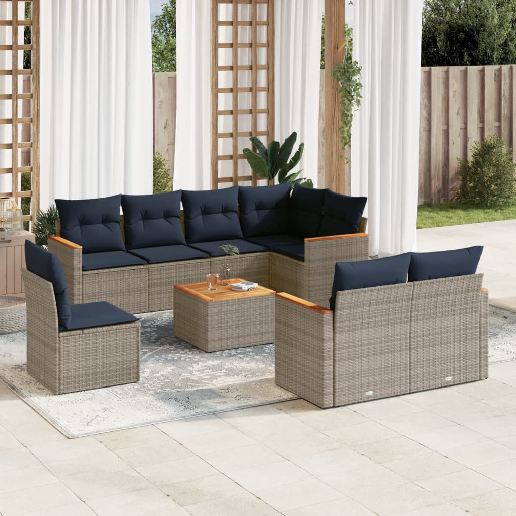 9 pcs conjunto sofás p/ jardim c/ almofadões vime PE cinzento