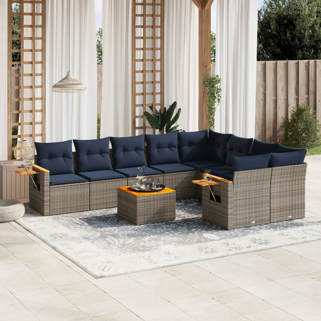 10 pcs conjunto sofás p/ jardim c/ almofadões vime PE cinzento