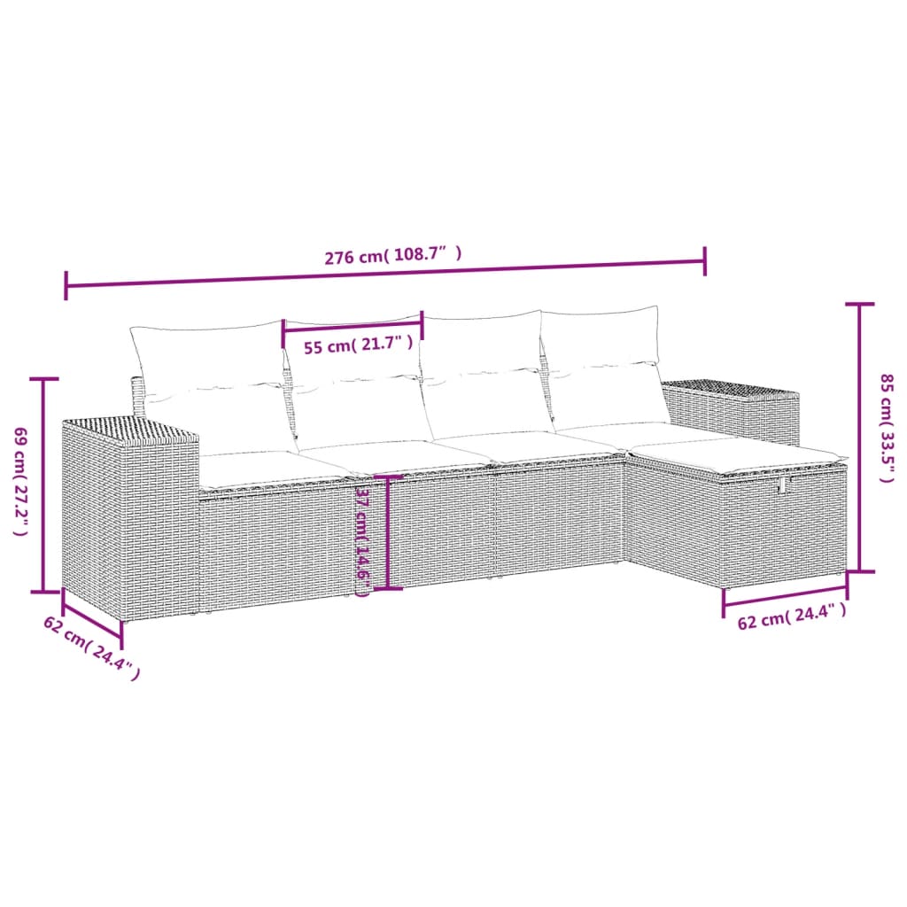 5 pcs conjunto sofás p/ jardim c/ almofadões vime PE castanho