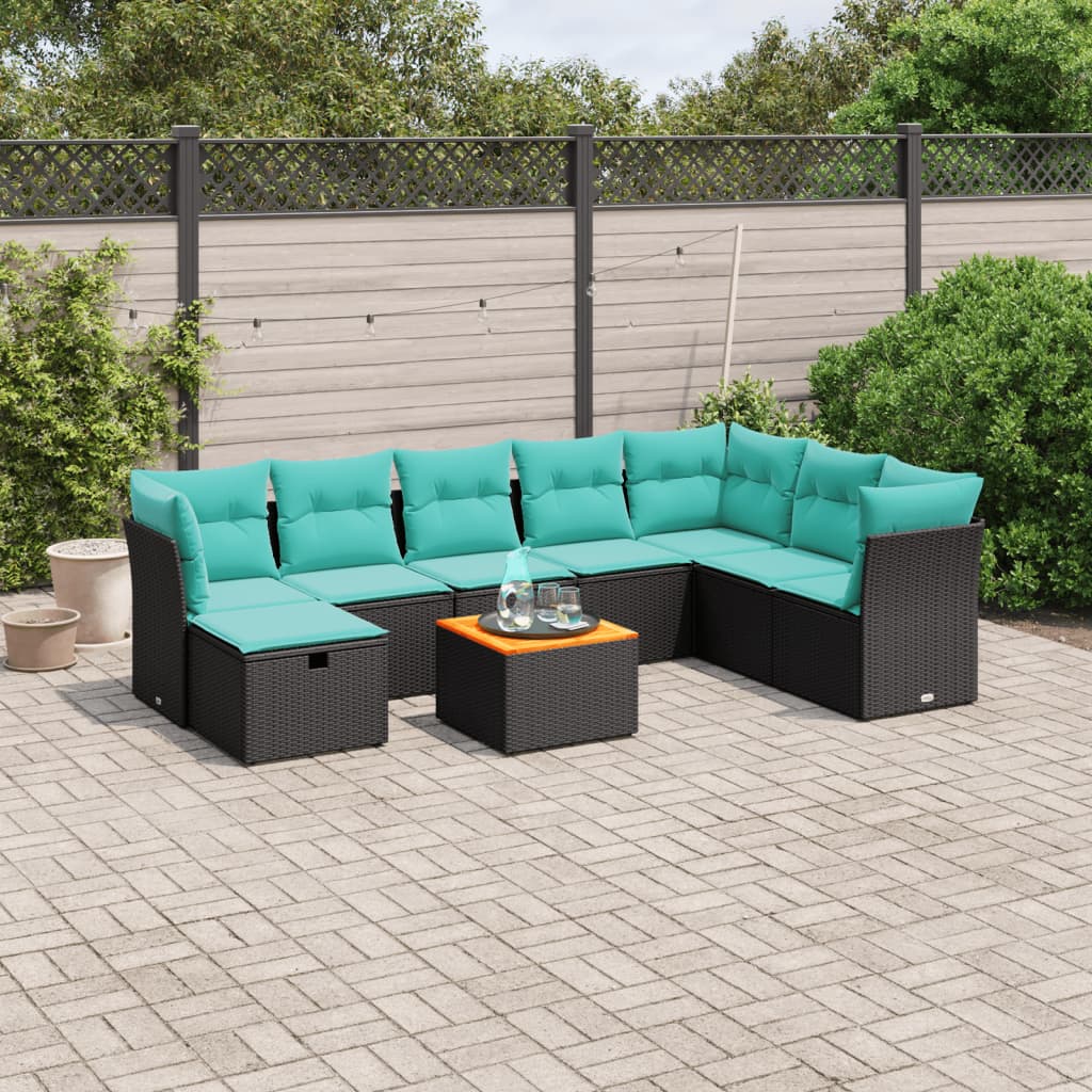 9 pcs conjunto de sofás p/ jardim c/ almofadões vime PE preto