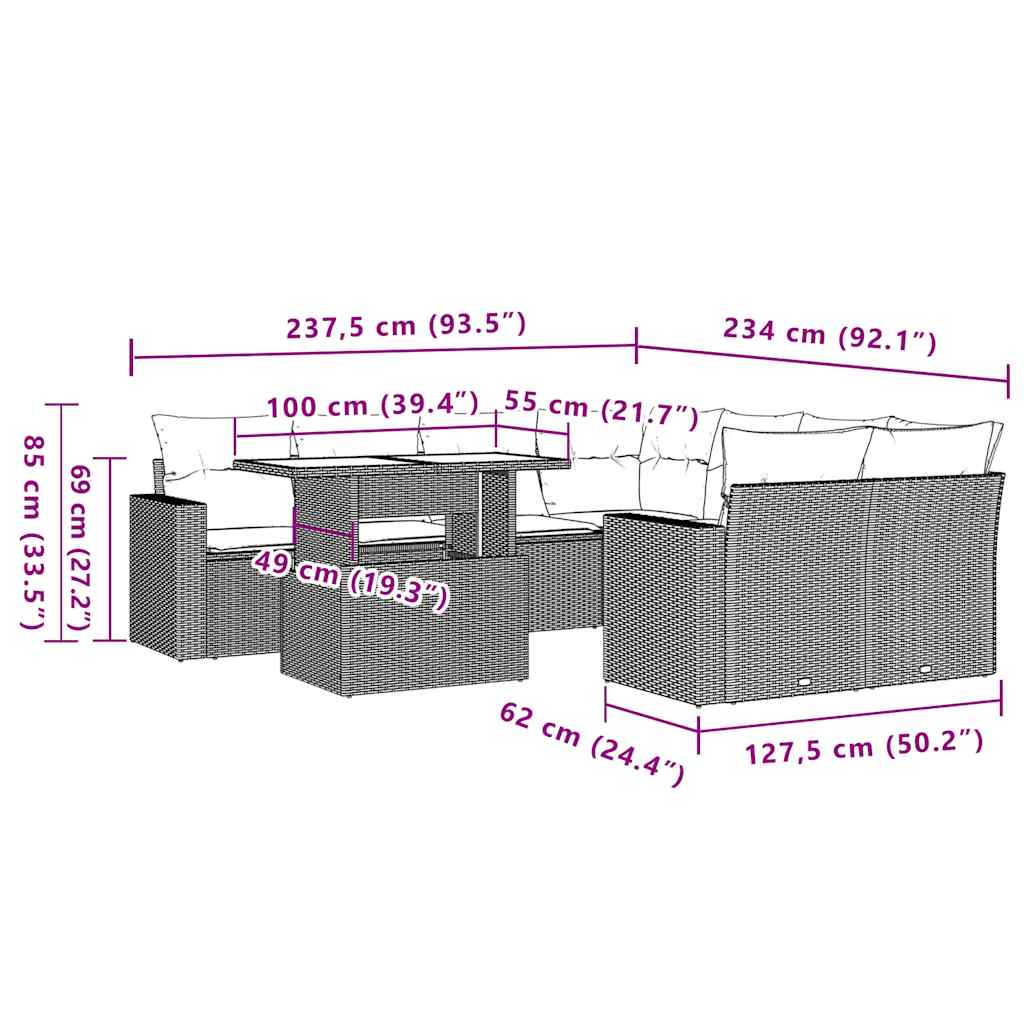 9 pcs conjunto de sofás p/ jardim com almofadões vime PE bege