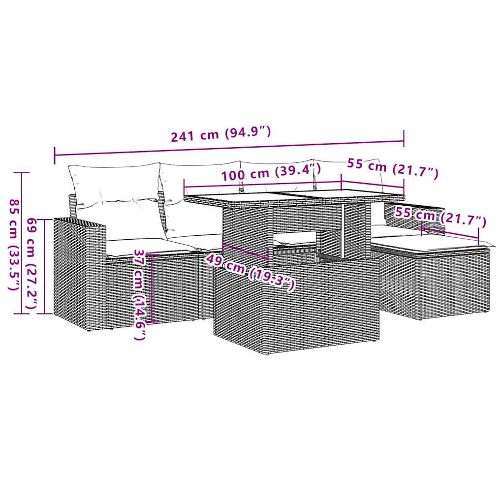 6 pcs conjunto sofás de jardim c/ almofadões vime PE preto