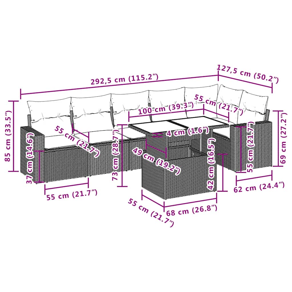 7 pcs conj. sofás jardim com almofadões vime PE cinzento-claro