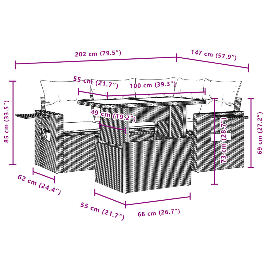 5 pcs conjunto sofás p/ jardim c/ almofadões vime PE castanho