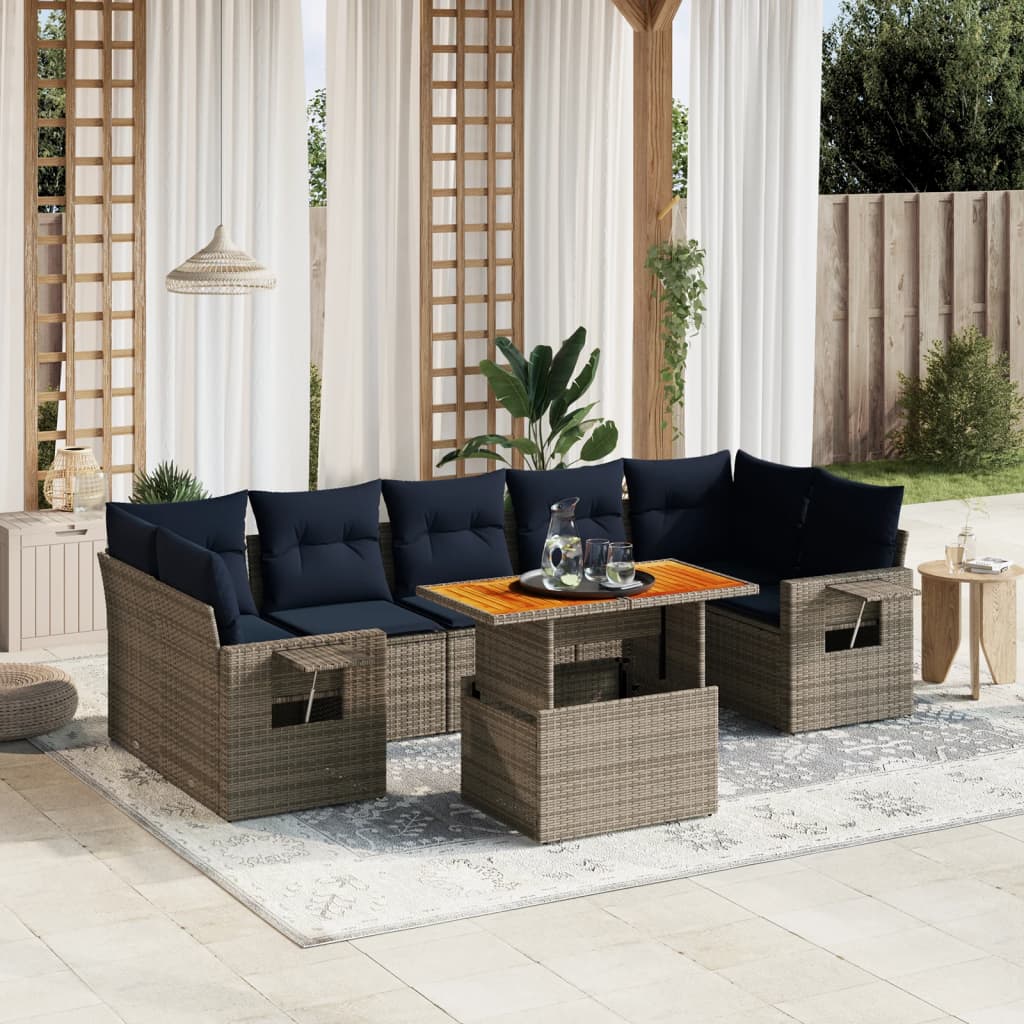 8 pcs conjunto sofás p/ jardim c/ almofadões vime PE cinzento