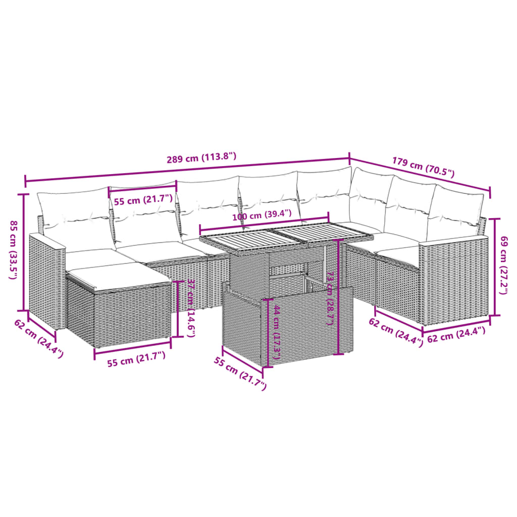 9 pcs conjunto de sofás p/ jardim c/ almofadões vime PE preto