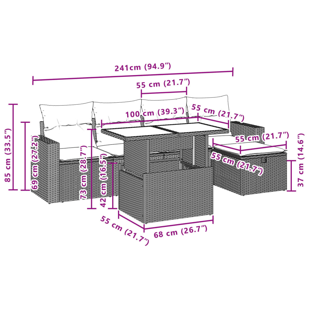 6 pcs conjunto de sofás p/ jardim com almofadões vime PE bege