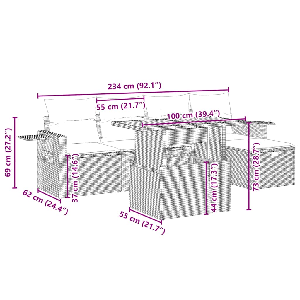 6 pcs conjunto de sofás p/ jardim com almofadões vime PE bege