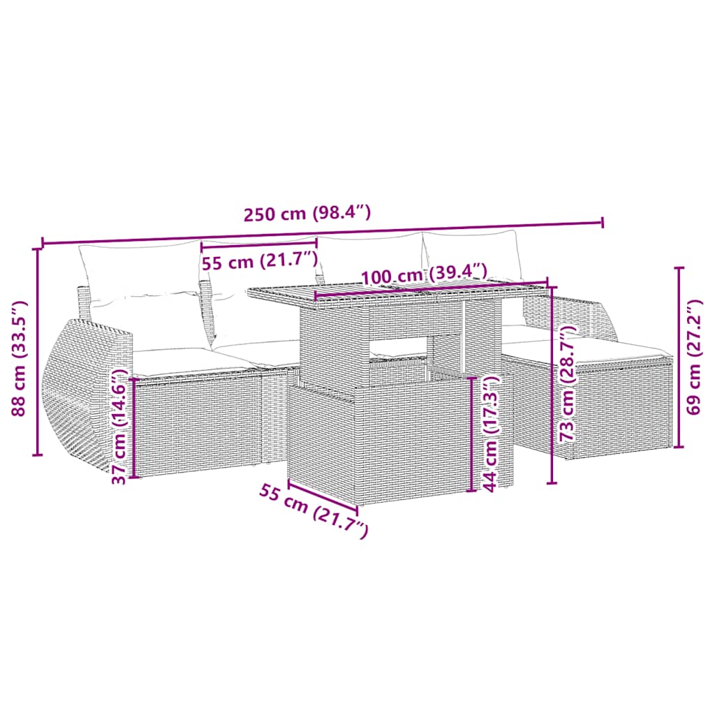 6 pcs conjunto de sofás p/ jardim com almofadões vime PE bege