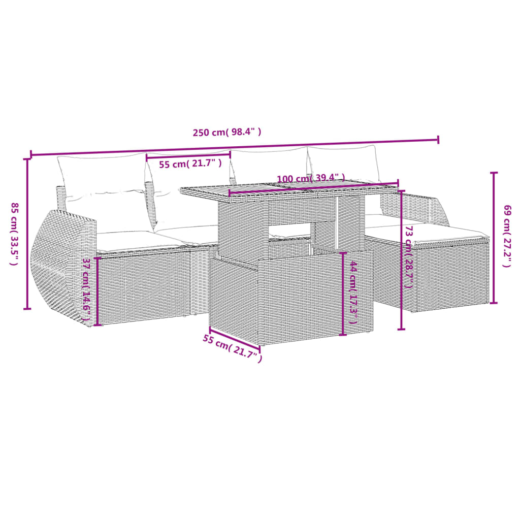 6 pcs conjunto de sofás p/ jardim com almofadões vime PE bege