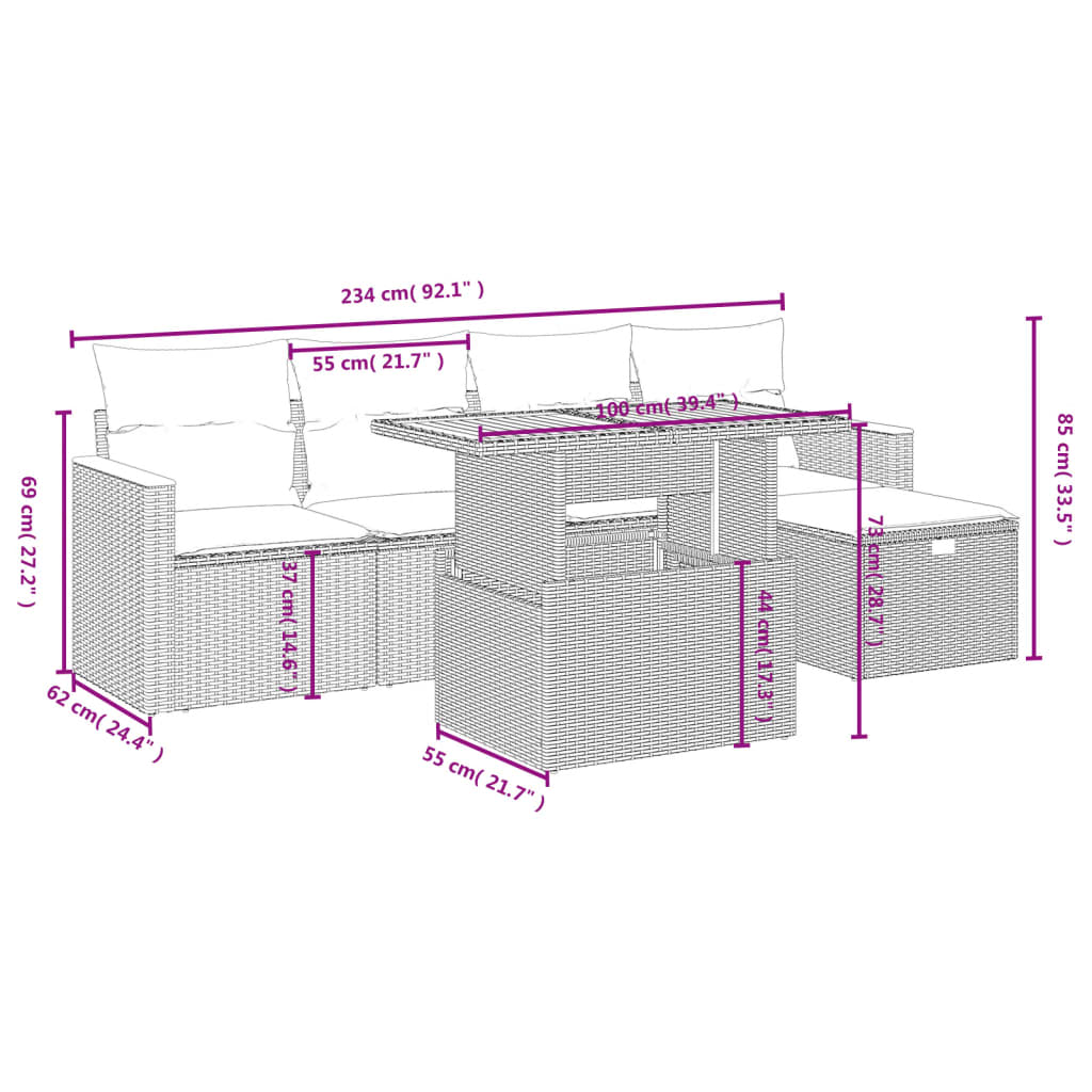 6 pcs conjunto sofás de jardim com almofadões vime cinzento