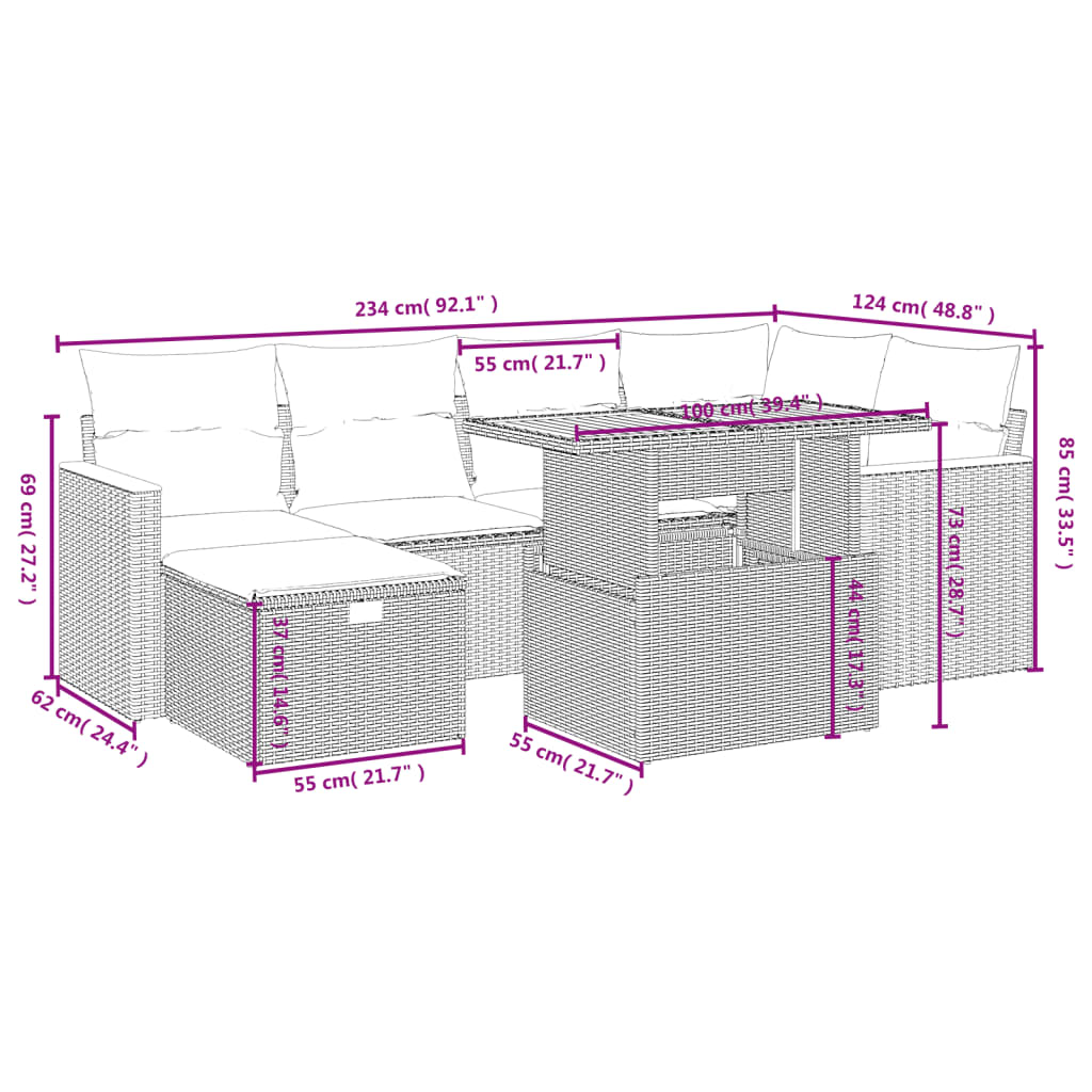 7 pcs conjunto de sofás p/ jardim c/ almofadões vime PE preto