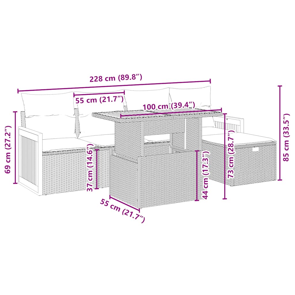 6 pcs conjunto de sofás p/ jardim com almofadões vime PE bege