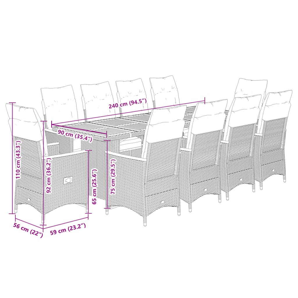 11 pcs conjunto bistrô de jardim c/ almofadões vime PE cinzento