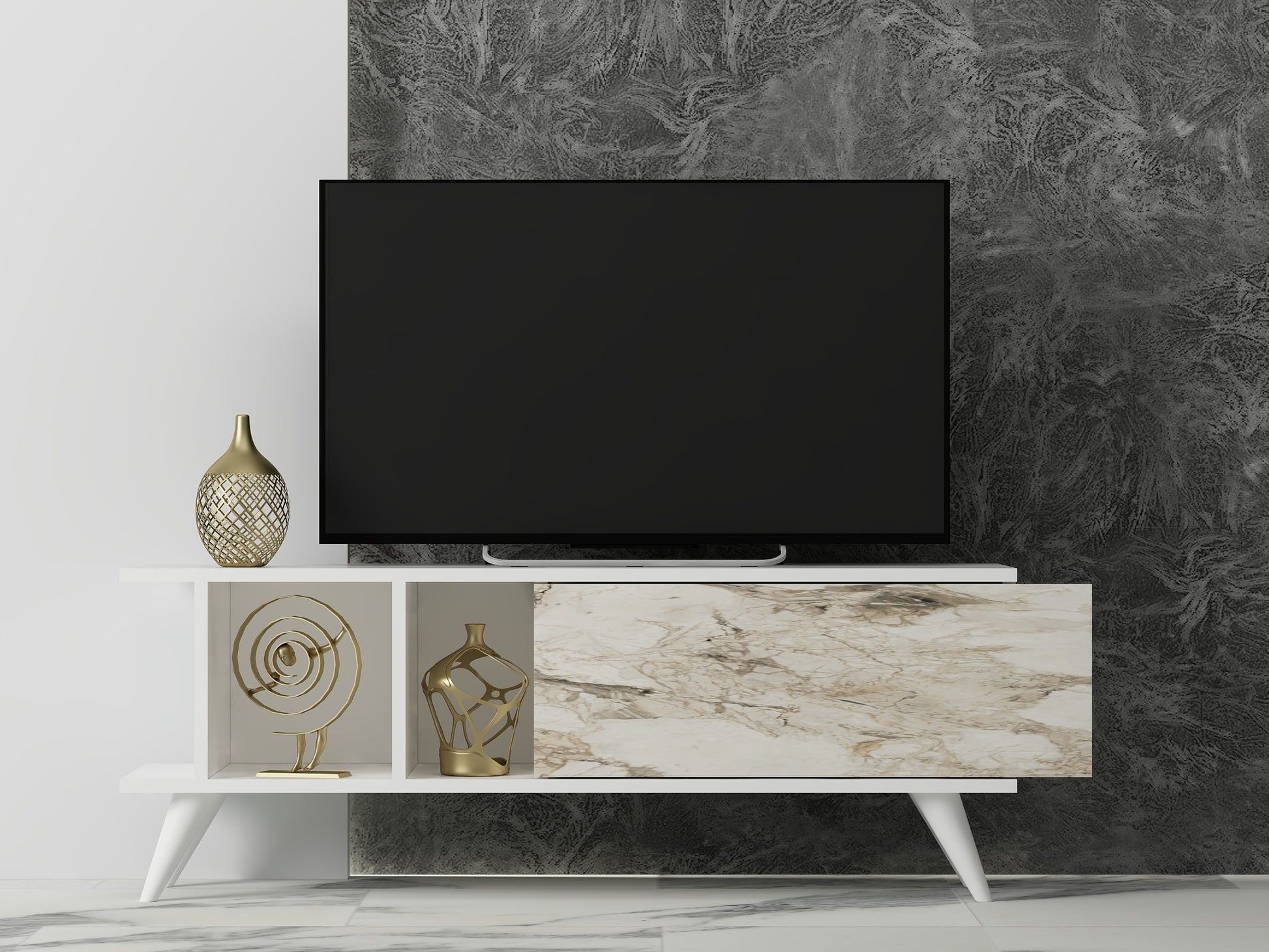 Móvel de TV – 120 cm x 30 cm x 45 cm – Branco e Mármore – MDF