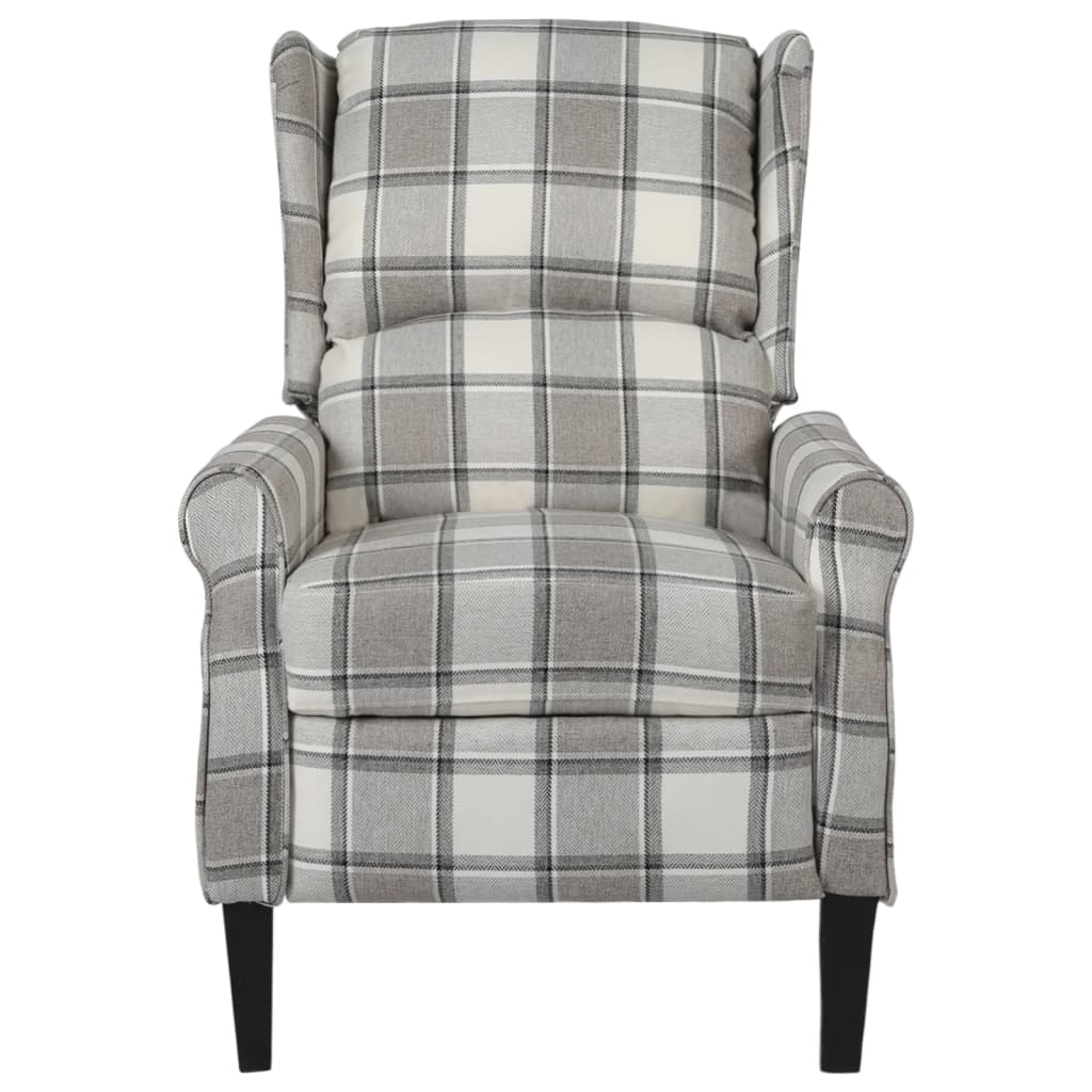 A poltrona reclinável é feita de tecido e é suportada por pés em madeira, tornando-a um espaço de assento durável e macio. O encosto é ajustável para trás e o apoio de pés pode ser ajustado para cima, permitindo-lhe deitar-se confortavelmente.