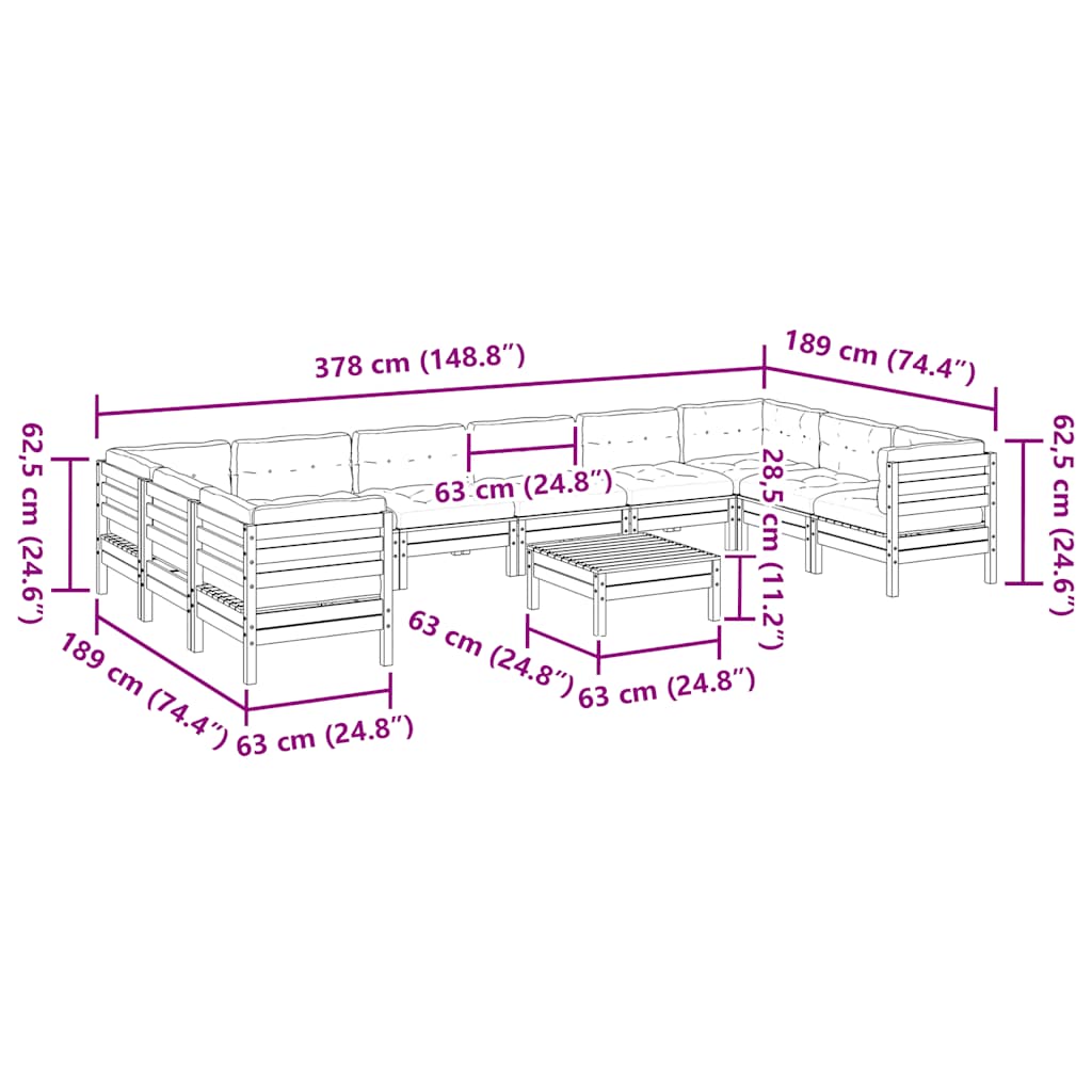 11pcs conj. sofás jardim c/ almofadões madeira pinho impregnada