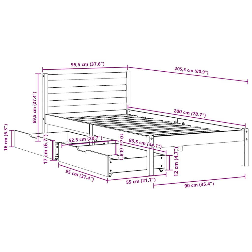 Cama sem colchão 90x200 cm madeira de pinho maciça