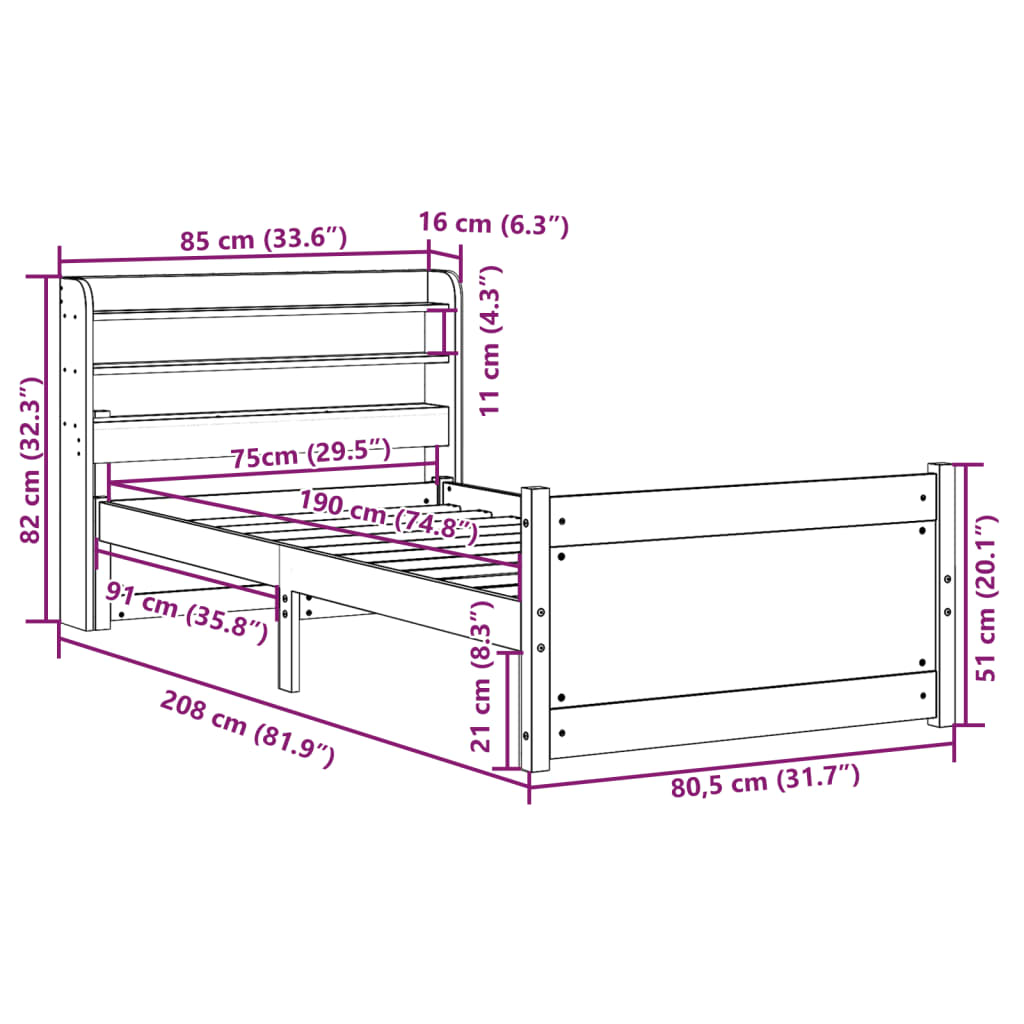 Estrutura cama c/ cabeceira 75x190 cm pinho maciço