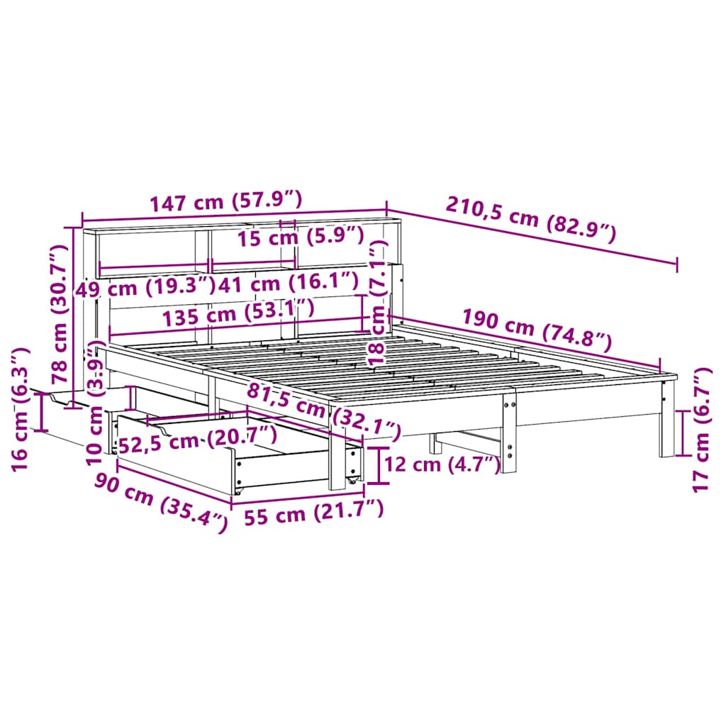 Cama com estante sem colchão 135x190 cm pinho maciço