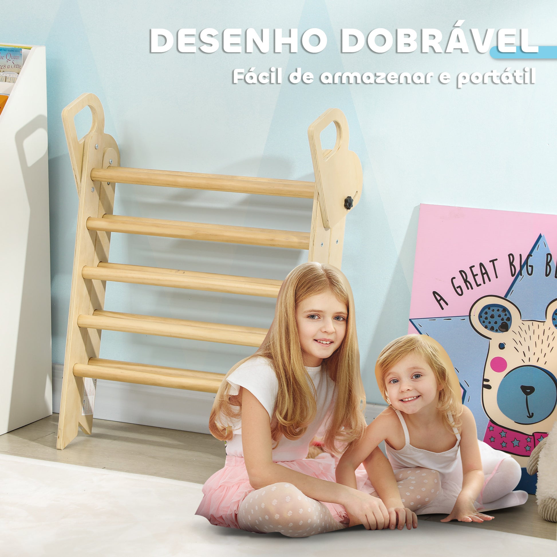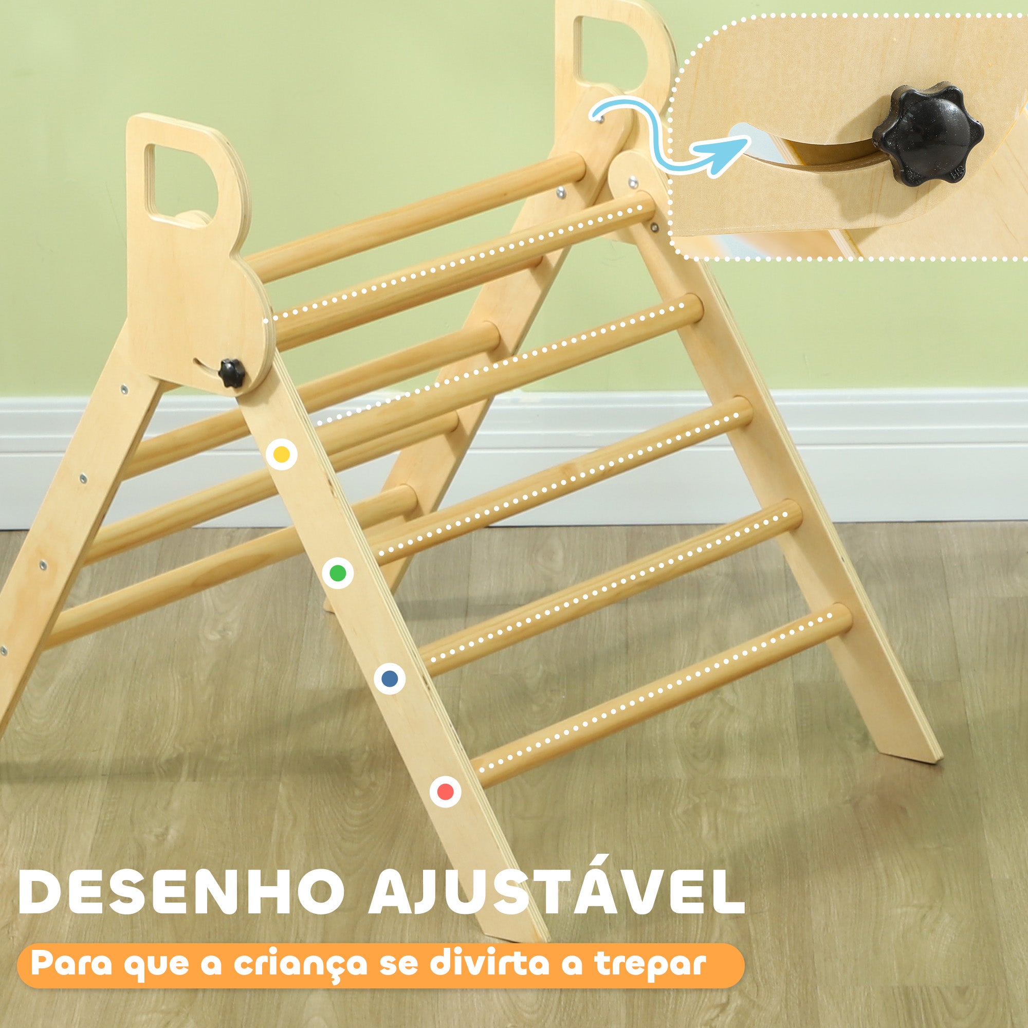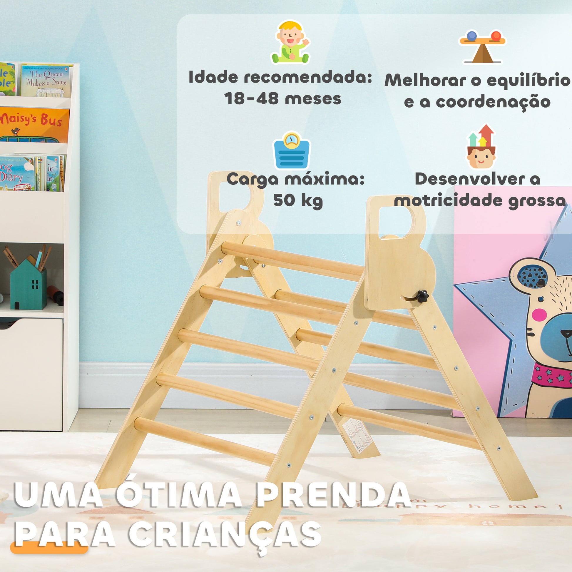 O Triângulo de Escalar de Madeira Dobrável é perfeito para desenvolver habilidades de equilíbrio e coordenação em crianças de 18 a 48 meses. Feito de madeira de pinho com cantos arredondados, em conformidade com as normas de segurança, proporciona uma experiência segura e durável para os seus filhos.