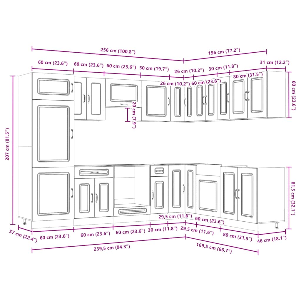 - 1 x armário de cozinha: 60 x 57 x 207 cm (L x P x A)
