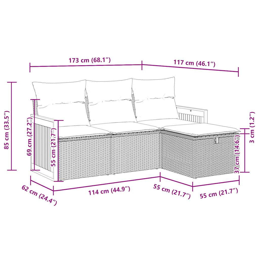 4 pcs conjunto de sofás para jardim c/ almofadões vime PE bege