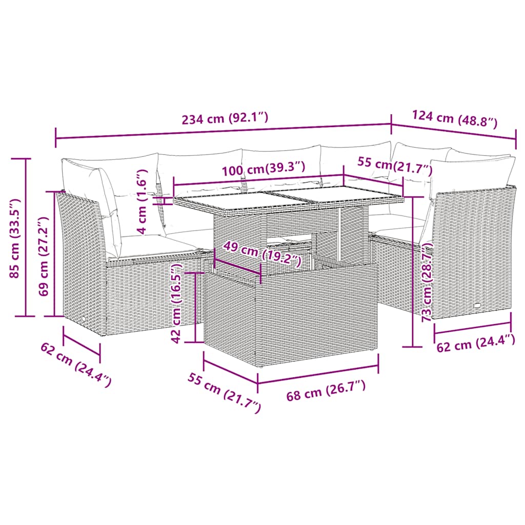 6 pcs conj. sofás jardim c/ almofadões vime PE/acácia castanho