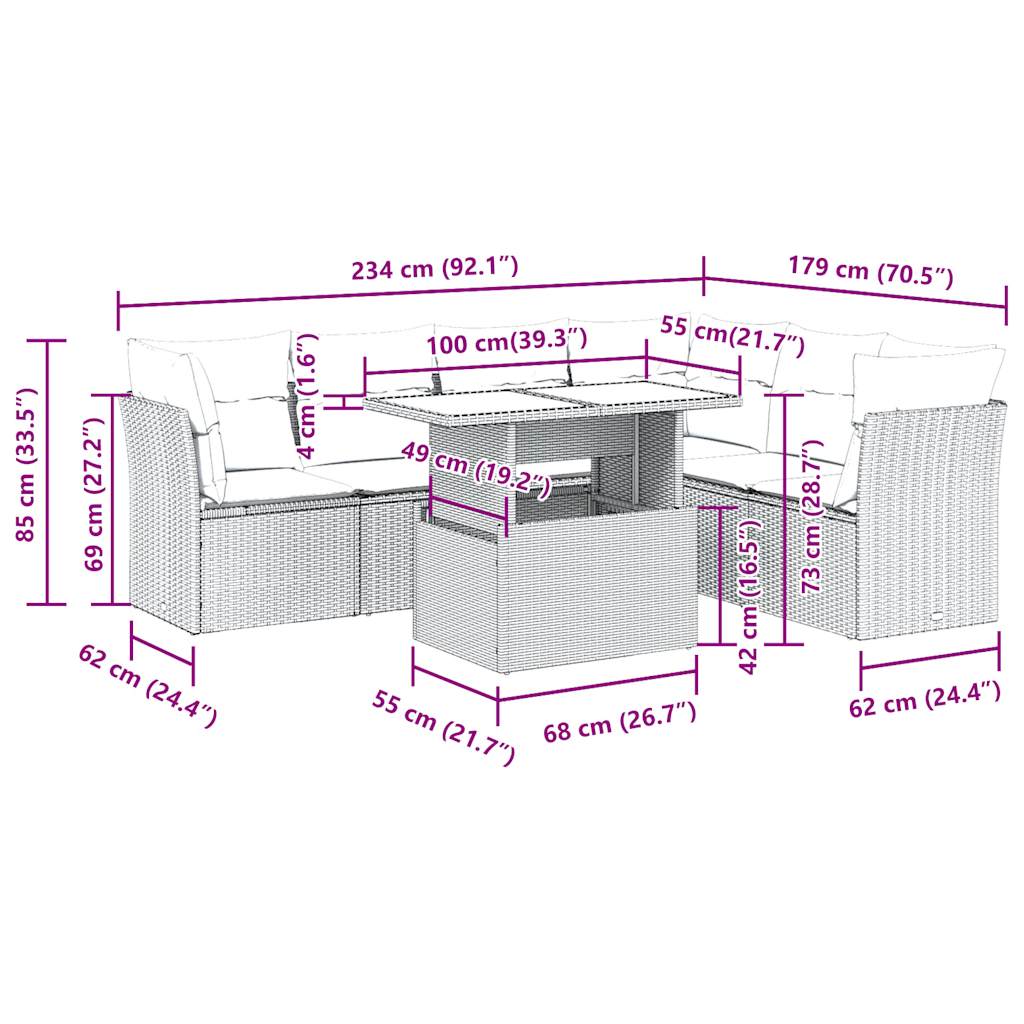 7 pcs conjunto de sofás p/ jardim c/ almofadões vime PE preto