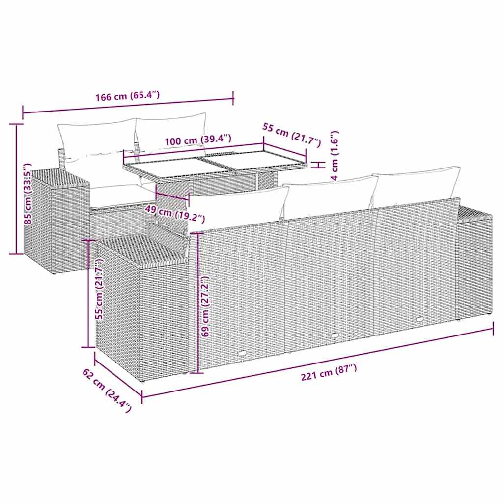 6 pcs conjunto de sofás jardim c/ almofadões vime PE castanho