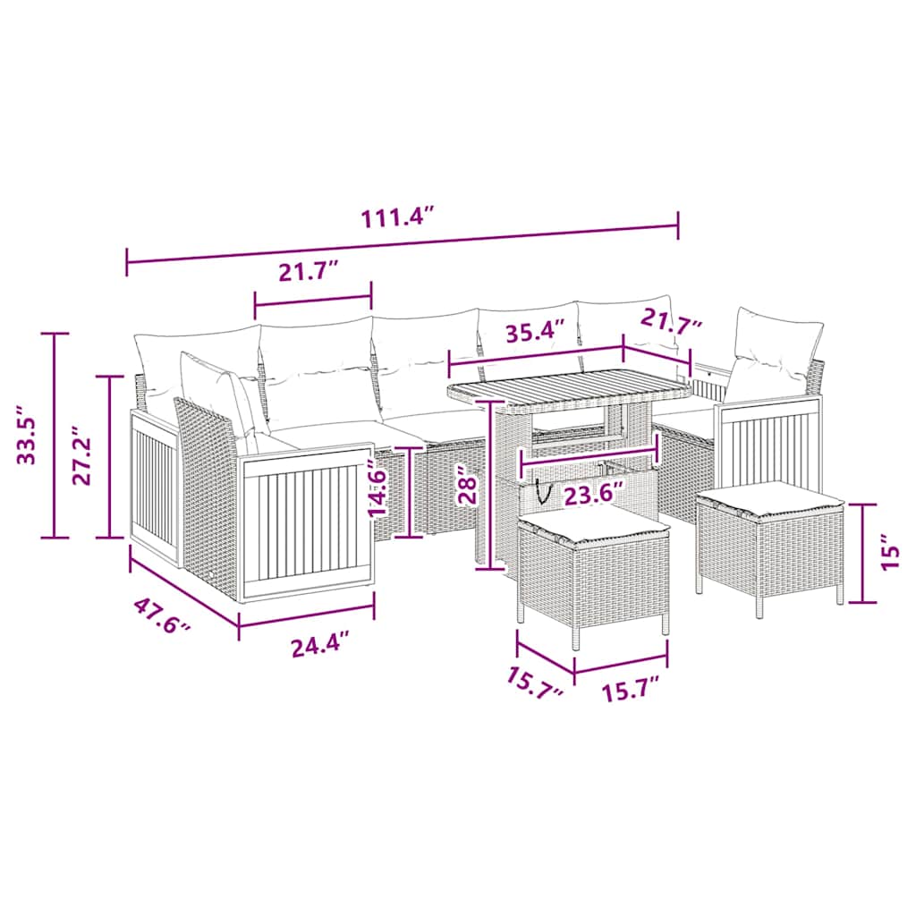 - Componentes Funcionais: Com armazenamento embutido no design, o conjunto tem sofás de braços, assentos centrais e pufes, todos com espaço prático embaixo. Esse recurso inteligente ajuda a manter seu espaço externo arrumado e maximiza a usabilidade.