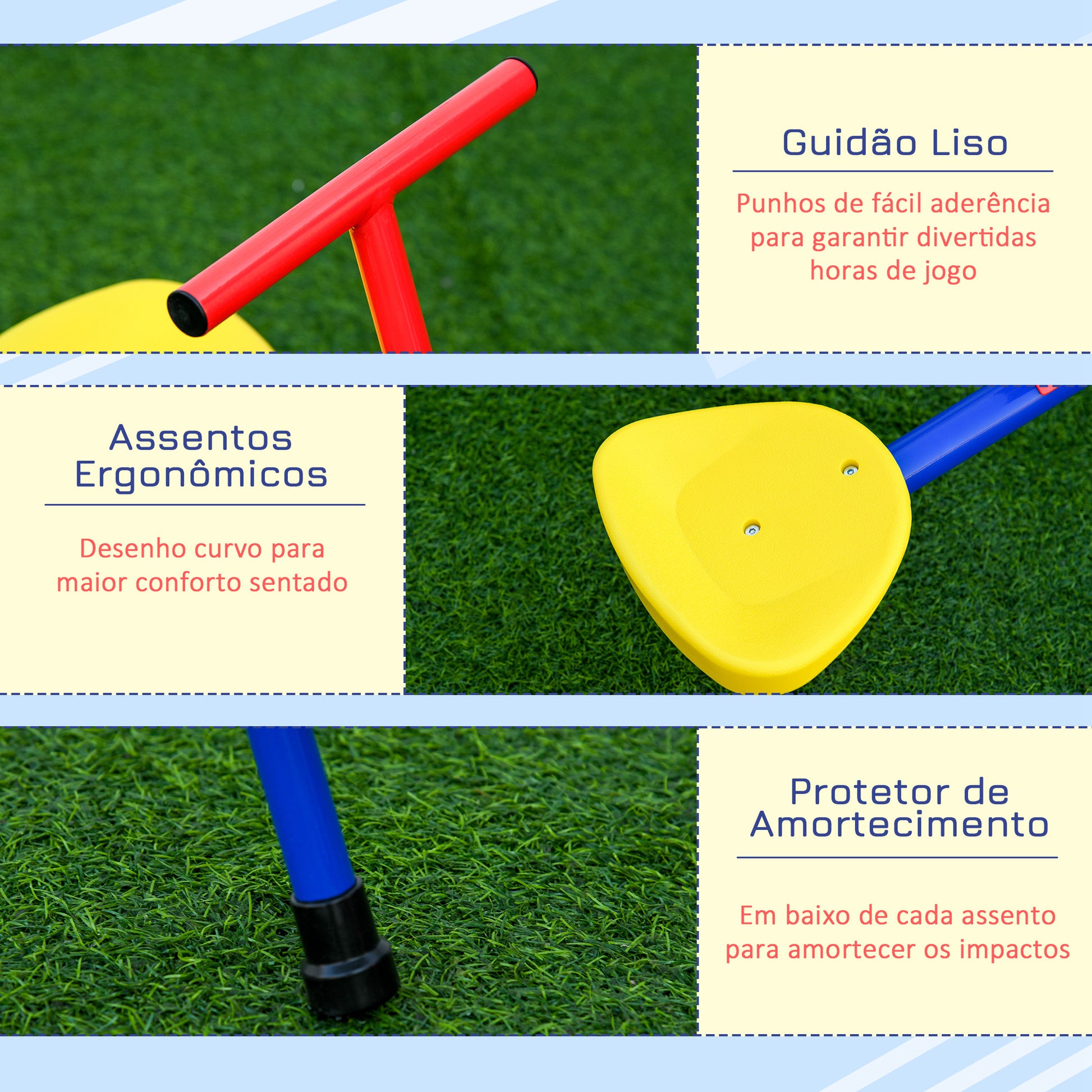 - Benefícios: Promove habilidades motoras, segurança garantida com base de 4 hastes e paradas amortecedoras