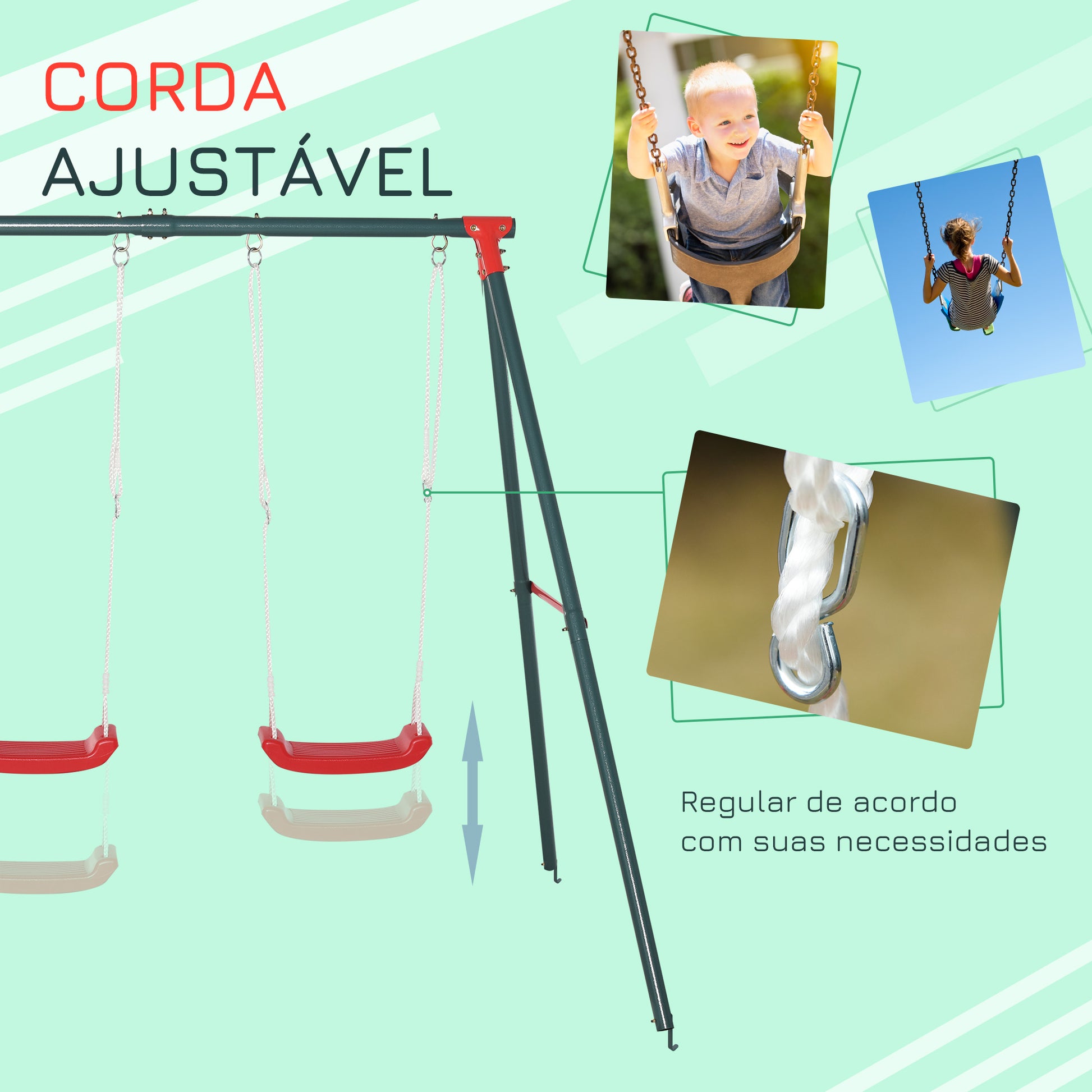 - Materiais: Estrutura metálica lacada, cordas ajustáveis e assento de polietileno (PE) com tratamento UV.