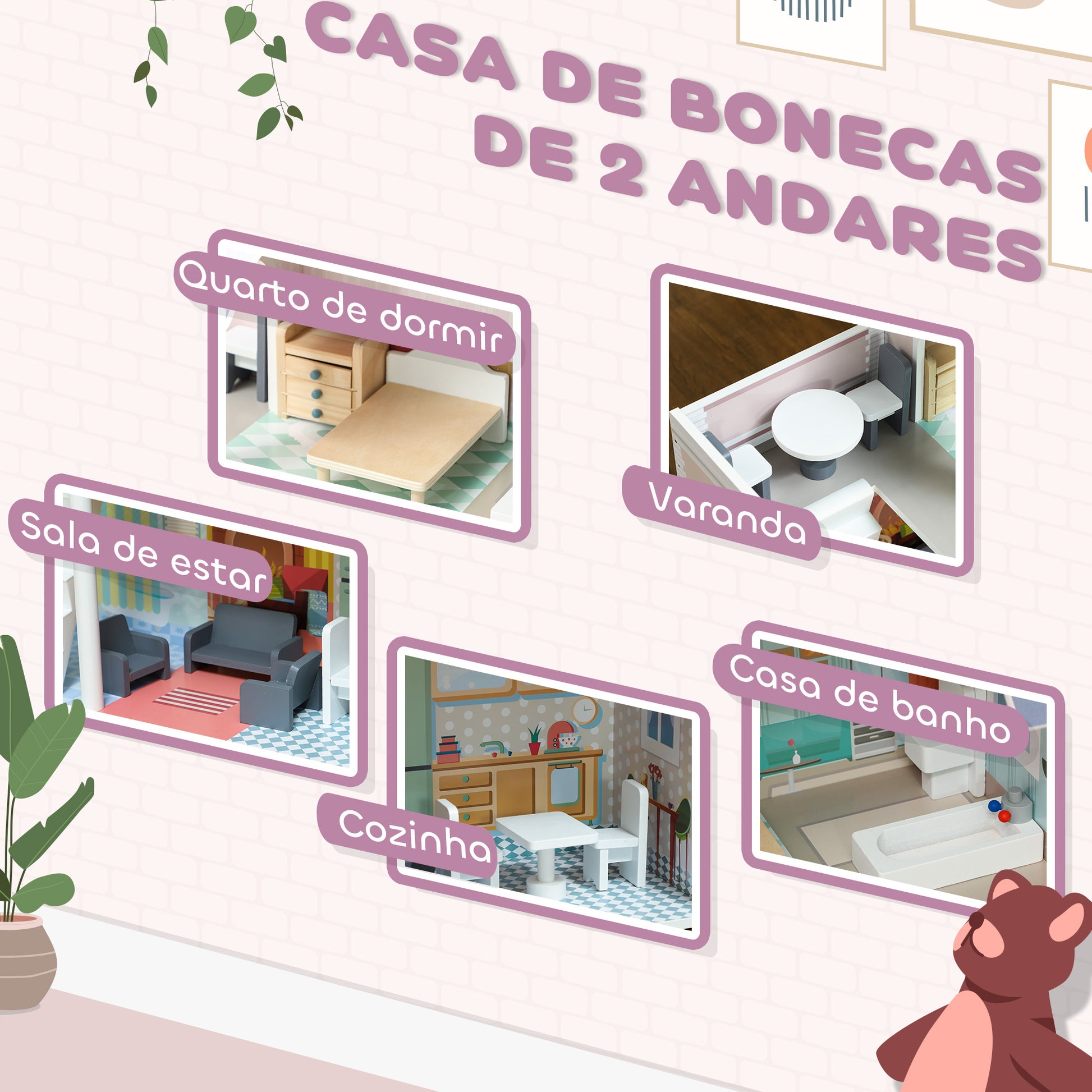 Descubra a casa de bonecas perfeita para estimular a criatividade das crianças com 60 cm de altura, 2 andares e uma encantadora varanda.