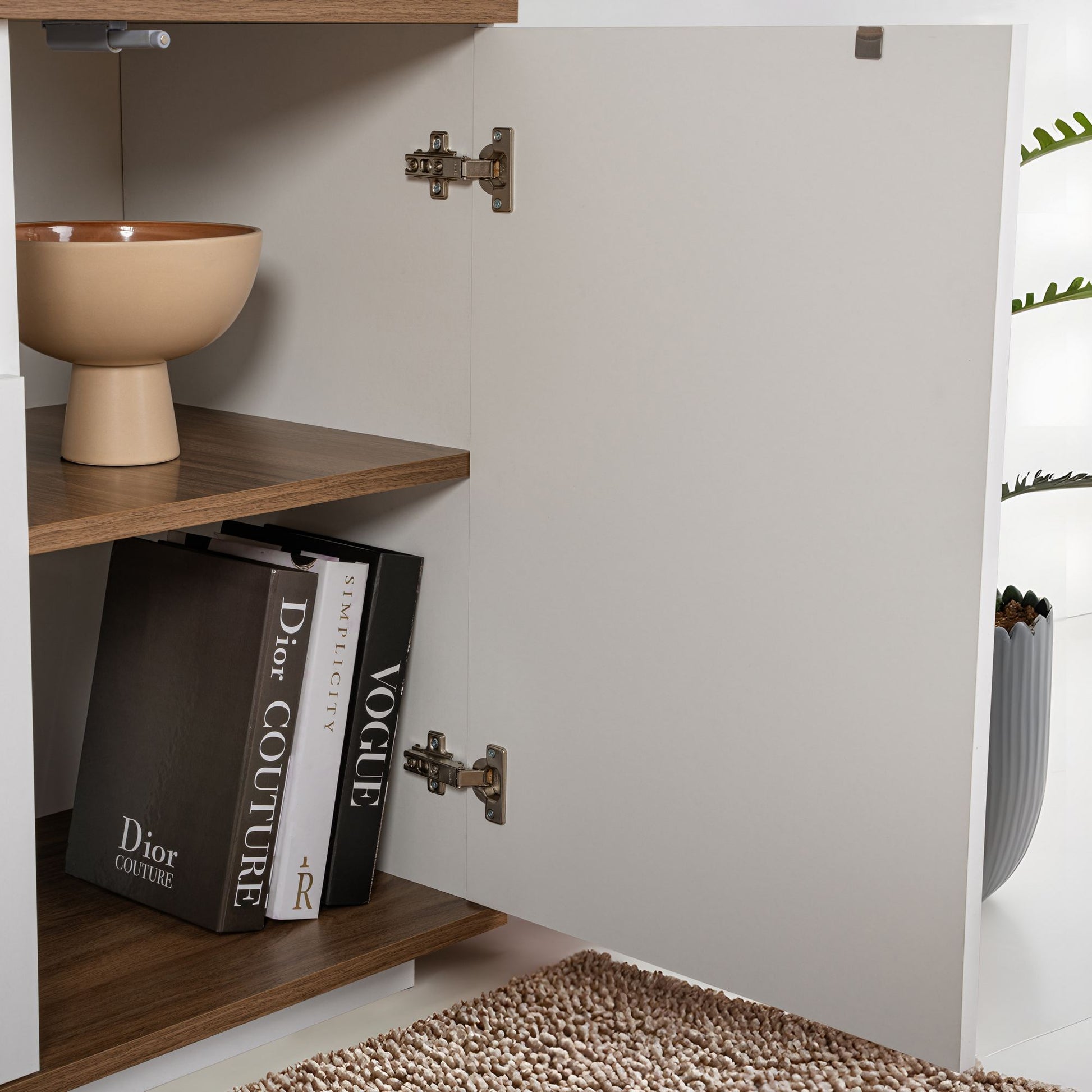 Construída com melamina de alta qualidade sobre aglomerado de 18mm de espessura, a Console Arista garante durabilidade excepcional e resistência ao uso diário. O acabamento premium em branco e nogueira não só proporciona uma estética refinada, como também facilita a manutenção, mantendo a sua beleza original ao longo dos anos. Com 75cm de altura, oferece a proporção perfeita para salas de estar, halls de entrada ou escritórios executivos.