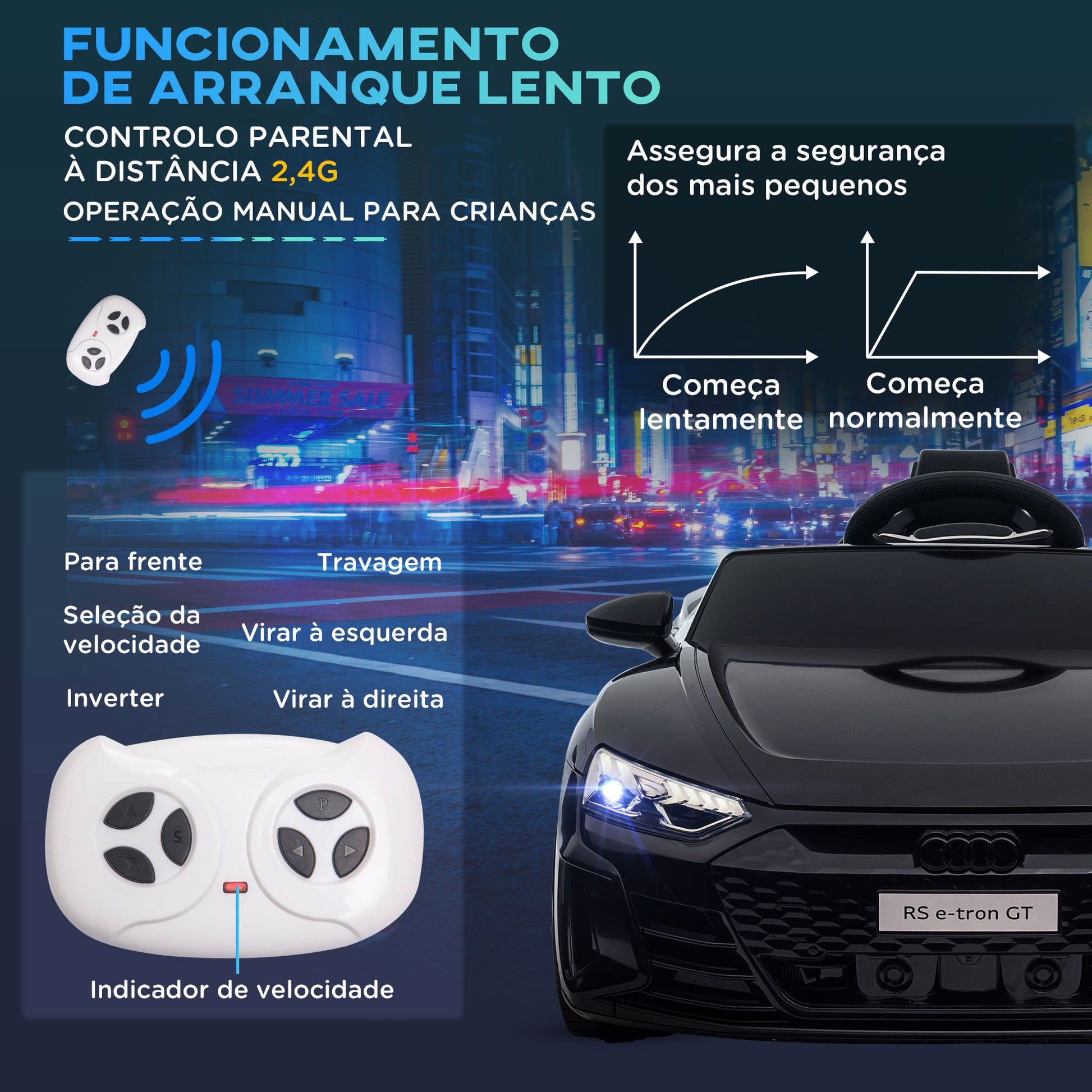 - Outras especificações: Bateria de 12V, controlo manual ou remoto, velocidade máxima de 3-5 km/h, certificado EN 71-1-2-3 e EN 62115
