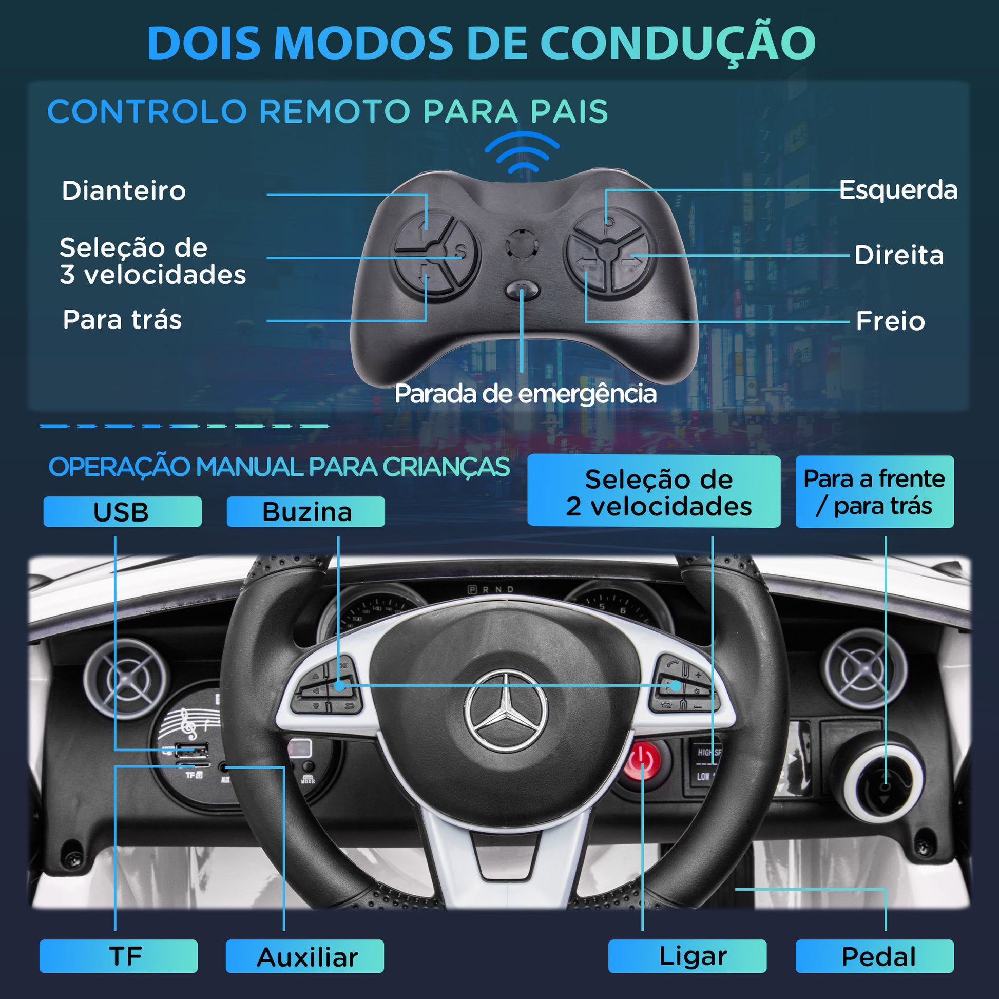 - Benefícios: Controle remoto com 2 modos, cinto de segurança, rodas largas, suspensão de absorção de choque, faróis de LED, música pré-instalada e muito mais.